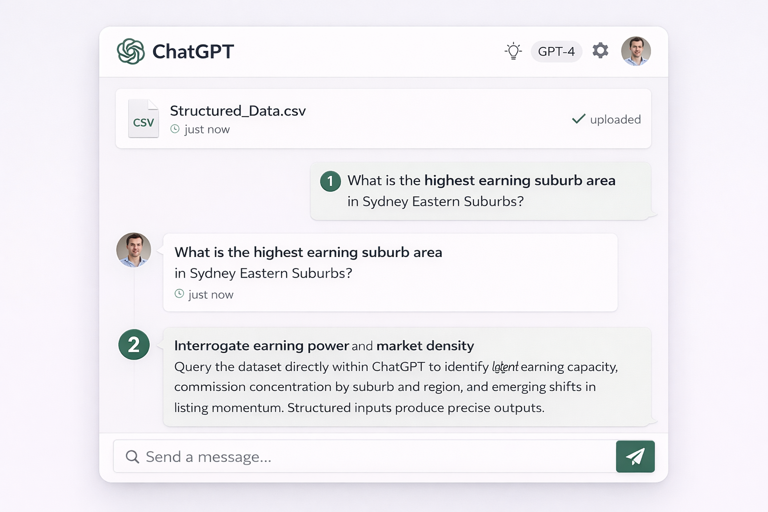 Query the dataset directly within ChatGPT to identify agent-level earning capacity, commission concentration by suburb and region, and emerging shifts in listing momentum. Structured inputs produce precise outputs.
